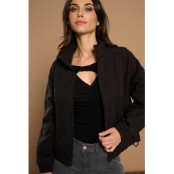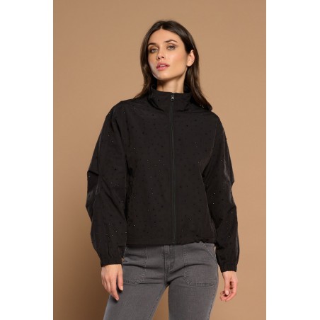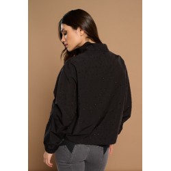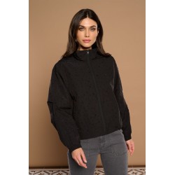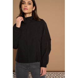 Giorgia Jacket de Minueto. Chaqueta de manga larga y cuello alto en color negro con cristales negros por toda ella que le aportan un brillo espectacular.