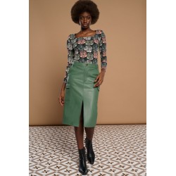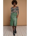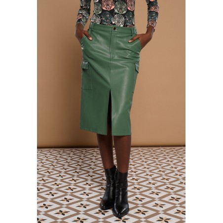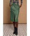 Emma Skirt Minueto. Falda tubo, hasta la zona de la rodilla, de cuero sintético en color verde. Dispone de cuatro bolsillos, dos de ellos con solapa a la altura del muslo. El cierre es de botón y tiene abertura frontal para una mejor movilidad.