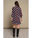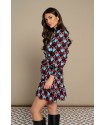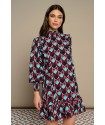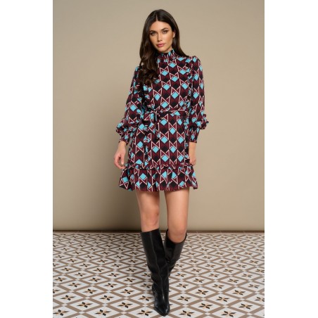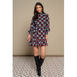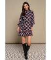 Ma Baker Dress Minueto. Vestido de manga larga abullonada, finalizada en nido de abeja ancho a conjunto del cuello alto. Es un vestido corto, con detalle de volantes tanto en el bajo como en el frontal, dispuestos en vertical en ambos lados. Lleva como complemento un lazo del mismo tejido para anudar a la cintura si se desea llevar ajustado, aunque el modelo viene dispuesto para llevar suelto en estilo recto. Es un vestido estampado de rombos en el que se combinan el granate con el azul y el negro y rayas en blanco.