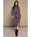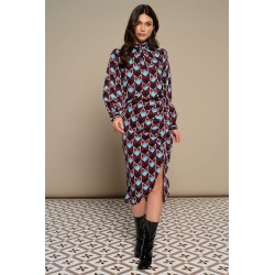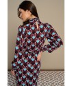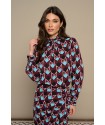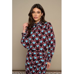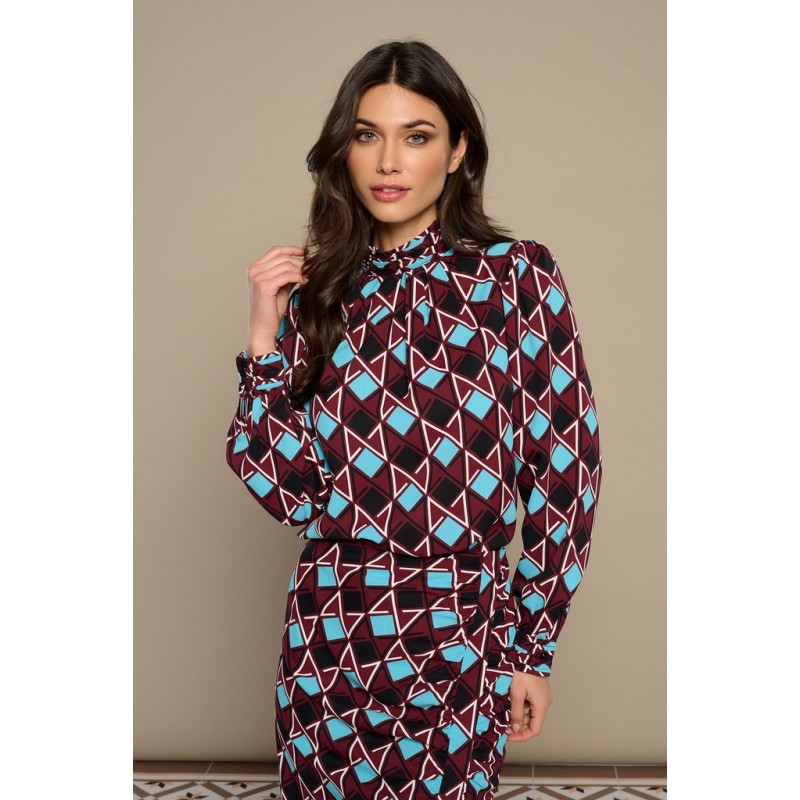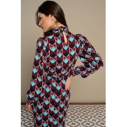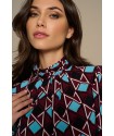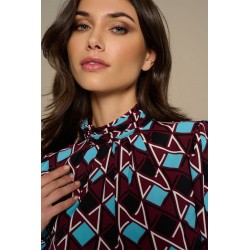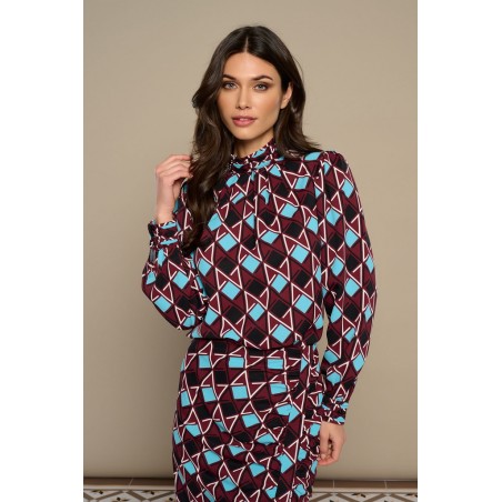Ma Baker Top Minueto. Blusa de manga larga, totalmente estampada de rombos en color granate, azul y negro con rayas blancas. El cuello es ligeramente alto, en un diseño muy original que también se ha utilizado en el puño de la manga, y se ata en la espalda con doble botón dando lugar a un escote en lágrima.