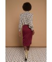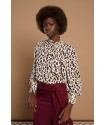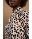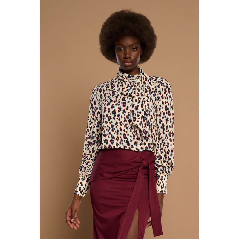 Leontina Top de la marca Minueto. Blusa de cuello perkins en animal print de leopardo. Dispone de lazada en la parte lateral del cuello y de manga larga acabada en puño. Su cierre es de cremallera oculta en el hombro.