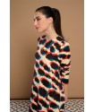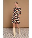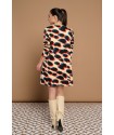 Gattina Dress Minueto. Vestido corto, de manga larga y cuello redondo, totalmente estampado de leopardos en tonos salmón, verde, blanco y gris sobre fondo negro, en un diseño ajustado al cuerpo muy favorecedor.