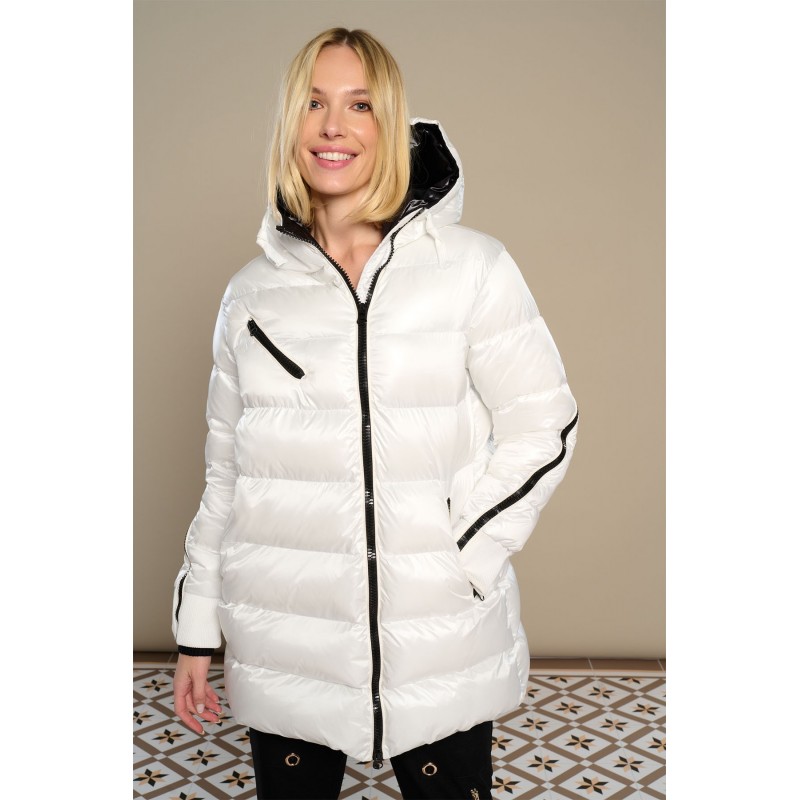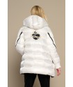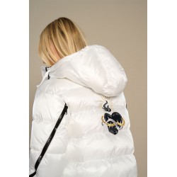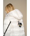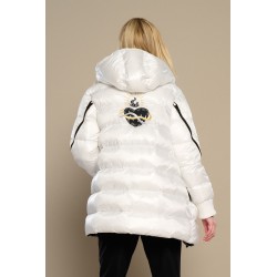 Mytho Coat de Minueto. Abrigo acolchado efecto nacarado con corazón bordado con espinas en la espalda. Con capucha y cierre de cremallera fronto lateral. Dispone de bolsillos laterales, así como de un pequeño bolsillo en pecho de cierre de cremallera. Cremalleras en las mangas.