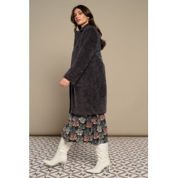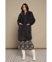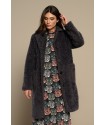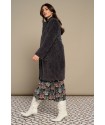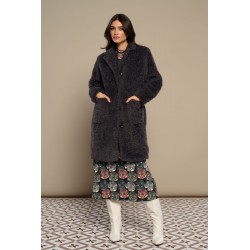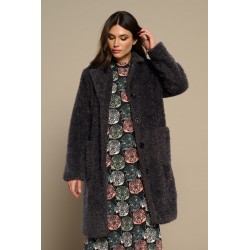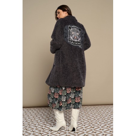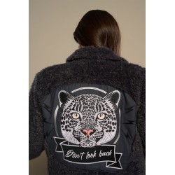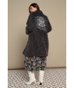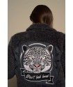 Gatto Coat de Minueto. Abrigo de borreguillo en color gris, de cuello solapa y manga larga, con bordado en la espalda de leopardo con la frase "don´t look back". Cierre de botones frontales y bolsillos laterales