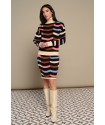 Gattina Dress Minueto. Vestido corto, de manga larga y cuello redondo, totalmente estampado de leopardos en tonos salmón, verde, blanco y gris sobre fondo negro, en un diseño ajustado al cuerpo muy favorecedor.