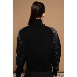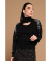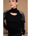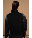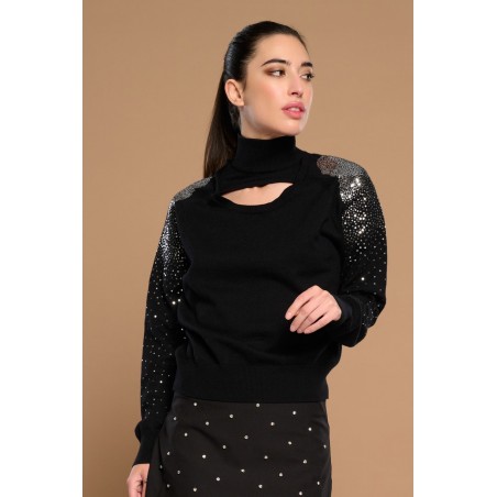 Unna Sweater Minueto. Jersey de punto en color negro, de cuello vuelto pero con detalle cut out en escote y con lentejuelas plateadas de hombro a mangas en efecto difuminado.