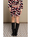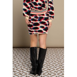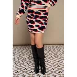 Mattea Skirt Minueto. Falda corta de punto, estilo de tubo, con base en color crema y diseño de manchas negras, azules y rojas tipo animal print de lepoardo.