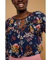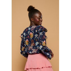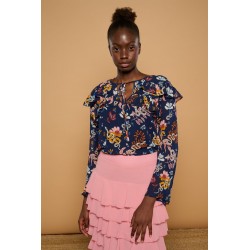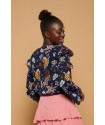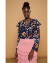 Aivis Top de Minueto. Blusa fresquita de la marca Minueto con un estampado floral con serpientes a todo color sobre un fondo azul oscuro. Dispone además de una camiseta de tirante ajustable interior, de cuello pico, en el mismo tono azul. La parte del cuello tiene un diseño con lazada para atar, si se desea, y presentar un escote en lágrima, o bien dejar suelto en escote en uve. Además dispone de doble volante en hombro y pecho que le aporta volumen y un aire juvenil. De manga larga y amplia.