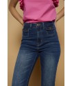 Medusa Jeans Minueto. Pantalones vaqueros de tiro alto con pequeños bolsillos de botón en el frontal y bordado floral y de serpientes en los bolsillos traseros que causan sensación. Son de pata ancha y largo tobillero deshilachado en el final. Un pantalón con todo detalle que no dejará indiferente a nadie y que no puedes dejar pasar.