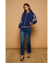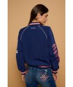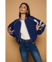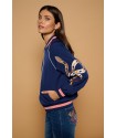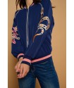 Medusa Jacket de Minueto. Chaqueta tipo bomber em color azul oscuro, de cierre de cremallera y con gom elástica en cuello, puños y bajo. Lleva bordadas ambas mangas en una combinación de colores dorado y rosa a contraste con la prenda que han quedado sublimes.