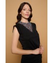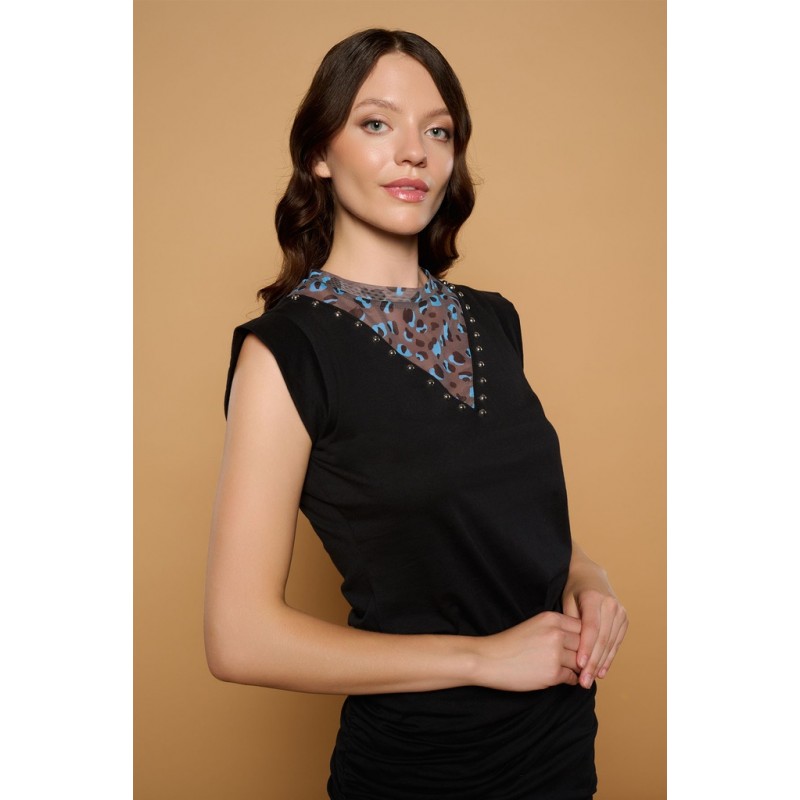Black Genetta Top Minueto. Camiseta de algodón en color negro de manga sisa. El cuello tiene una original combinación, ya que es cuello redondo con pico tanto en frente como en espalda solapando el tejido de algodón a un tul estampado animal print con fondo azul. Además en el frontal adornan tachas el escote dando como resultado una prenda cañera a la vez que delicada.