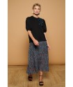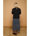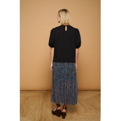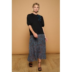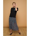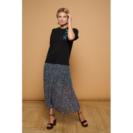 Fura Dress Minueto. Vestido de manga corta abullonada que combina una parte superior en color negro con una falda en animal print. Es un vestido que aparenta ser la combinación de dos prendas en una. La parte superior lleva bordada unas manchas animal print en color azulque combinan con la parte posterior o falda que es toda animal print en ese tono. El vestido es de largura midi y la falda es fluída y con volumen.