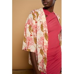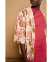 Ibossim Kimono de Minueto. Kimono de manga corta total print de leopardos y flores en tonos rosas sobre un fondo cava que sienta espectacular y podrás combinar con cualquier look, ya sea para un outfit más informal con unos vaqueros como para otro más serio, con el que ir a la oficina o a una quedada más especial. Un fondo de armario imprescindible que te dará muchas opciones en tu día a diá.