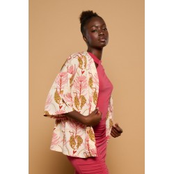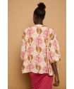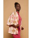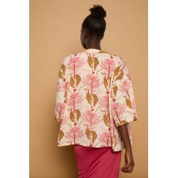 Payesa Top Minueto. Blusa totalmente estampada sobre un fondo cava en tonos tierra y azules. De manga corta caída y cuello mao, con cierre de botón hasta la zona del pecho. Disponde de aberturas laterales. De corta ámplio.