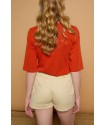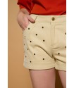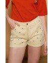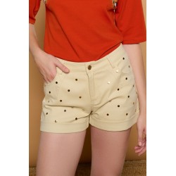 Magnesia Shorts de Minueto. Pantalones vaqueros cortos en color beige, de tiro alto, cierre de botón y cremallera y bolsillos laterales funcionales, así como traseros.Lo diferente e ideal de la prenda son sus tachas perfectamente colocadas en toda la parte frontal. Pantalones que podrás utilizar tanto en primavera como en verano y que no pasarán de moda ni inadvertidos.