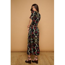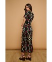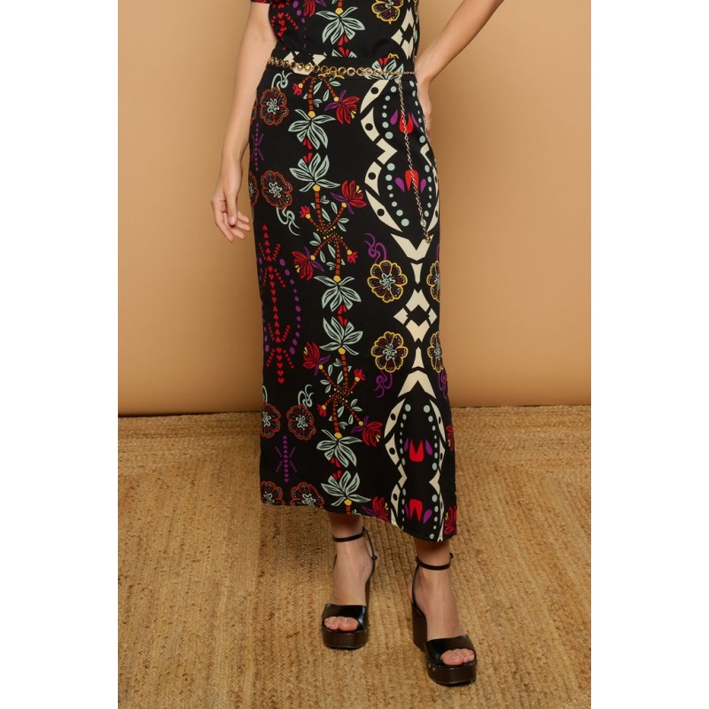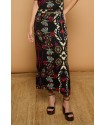 Boho Skirt Minueto. Falda larga con estampado estilo boho de flores y palmeras a todo color sobre un fondo negro a contraste. Con abertura lateral para mejor movilidad y comodidad.
