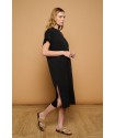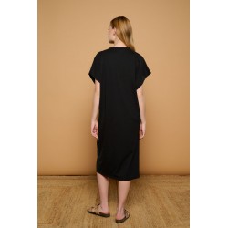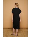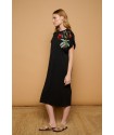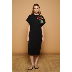 Black Boho Dress Minueto. Vestido largo por la rodilla, de manga caída y corte ámplio, en color negro con un bordado increible en el hombro izquierdo a todo color que atraerá las miradas. Con abertura en el lateral derecho que le aporta un toque especial. Un vestido fresco y muy versatil que podrás utilizar en cualquier ocasión, ya sea con algún complemento tipo cinturón para enmarcar la figura o suelto para ir más cómoda.