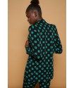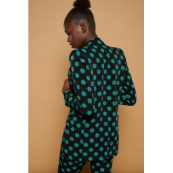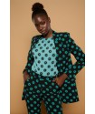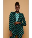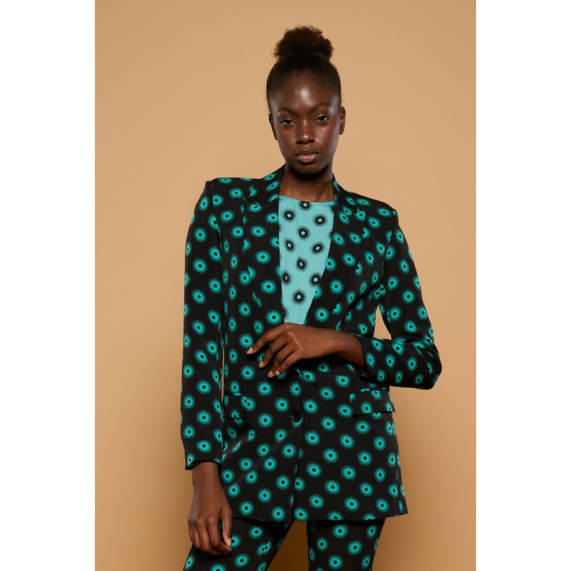Sa Talaia Jacket de Minueto. Chaqueta tipo americana, de solapa ancha con total print de soles en color azul turquesa sobre un fondo negro a contraste. Falsos bolsillos y cierre de botón. Americana con mucho estilo que llama la atención por su originalidad, tanto para ocasiones relajadas combinada con unos vaqueros para ir de comida con amigas como para otras más formales como ir a la oficina con un pantalón más vestido o a un evento próximo y atraer todas las miradas.
