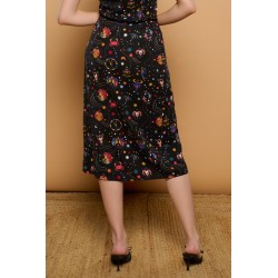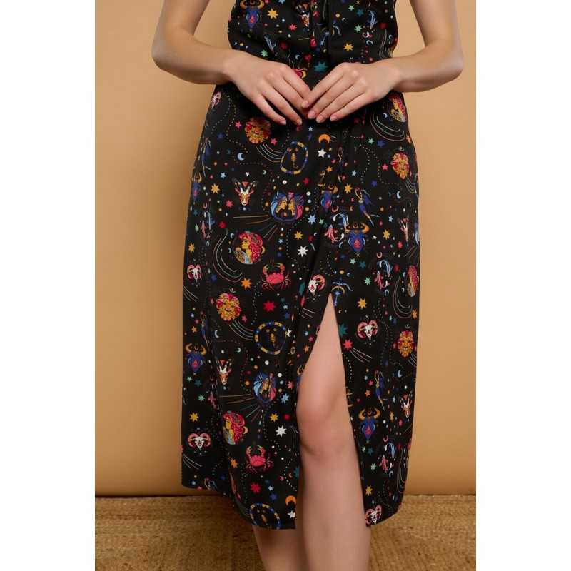 Ordi Skirt Minueto. Falda fluída con corte en A desde la cintura y larga hasta debajo de la rodilla, con abertura lateral izquierda que le aporta movimiento. Su estampado de signos del zodiaco a todo color sobre fondo negro la convierten en una prenda con mucho rollo. Dale un estilo serio con unos tacones o uno más cañero con unas botas altas y disfrútala en cualquier ocasión que se te presente.