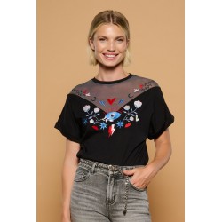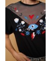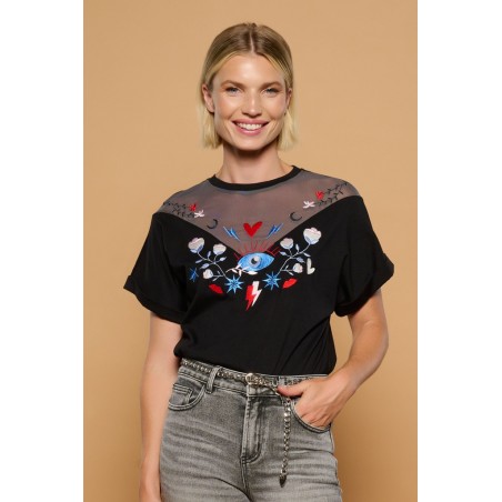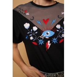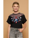 Bonita Top Minueto. Camiseta de manga corta con dobladillo, corte ámplio y cuello redondo, donde combina el tul simulando un cuello de hombro caído muy original. Con base en color negro y con unos bordados en el frontal, tanto en el tejido de algodón como en el de tul, en colores blanco, azul, negro y rojo. Una prenda cómoda y original que gracias a su diseño frontal se presenta como una alternativa única frente a la típica camiseta de verano. No la dejes pasar.