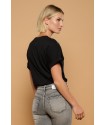 Black Genetta Top Minueto. Camiseta de algodón en color negro de manga sisa. El cuello tiene una original combinación, ya que es cuello redondo con pico tanto en frente como en espalda solapando el tejido de algodón a un tul estampado animal print con fondo azul. Además en el frontal adornan tachas el escote dando como resultado una prenda cañera a la vez que delicada.