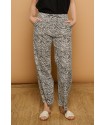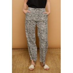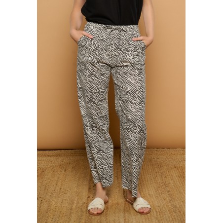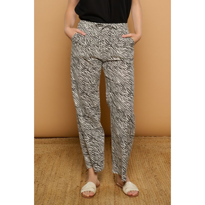 Zebra Trousers Minueto. Pantalones fluídos y frescos para este verano en animal print de cebra, con cinturilla elástica con cordón. Disponde de bolsillos delanteros funcionales que le aportan un plus y son de largo tobillero para que resulten más cómodos al poder combinarlos con una sandalia plana sin problemas.
