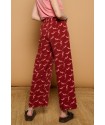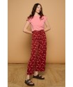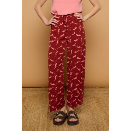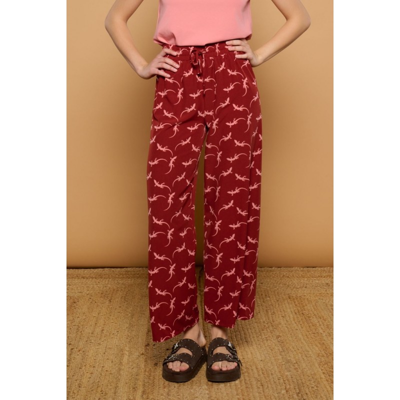 Pitiusas Trousers Minueto. Pantalones fluídos en color burdeos, totalmente estampados de lagartijas en color rosa. Con cinturilla elástica con cordones ajustables y un largo tobillero cómodo para poder llevar con sandalia plana este verano.