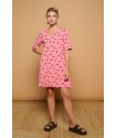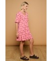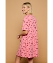 Sargantana Dress Minueto. Vestido de manga corta hasta el codo con fondo en color rosa y totalmente estampado de lagartijas en burdeos. Un vestido ámplio y fresco con cuello en uve que tan bien sienta y con una silueta sin marcar que aporta vuelo al bajo. Llévalo suelto o ponle un cinturón y dale tu propio estilo, abullonado sobre el mismo o marcando tu figura al máximo.Un vestido, varios looks posibles.