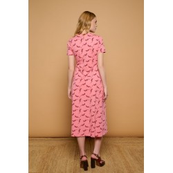 Gecko Dress Minueto. Vestido largo por debajo de la rodilla, con un patrón que enmarca la figura. De manga corta y cuello redondo en algodón. De color rosa y totalmente estampado de lagartijas.