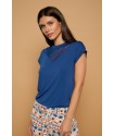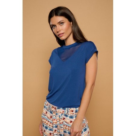 Blue Riu Top Minueto. Camiseta de manga corta en color azul con un original cuello redondo combinado con tul en cuello pico. Ideal como básica para combinar con cualquier prenda estampada de la marca.