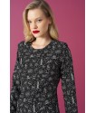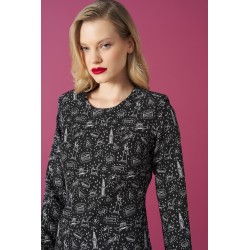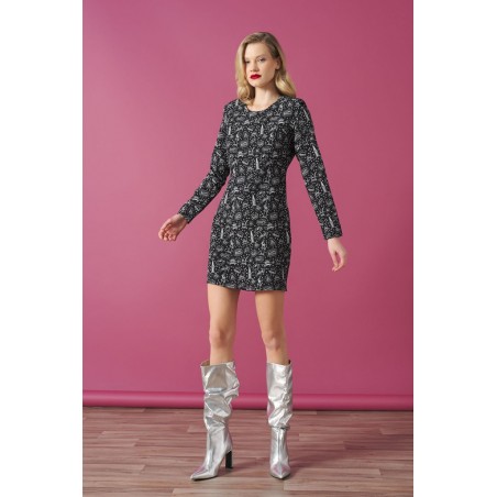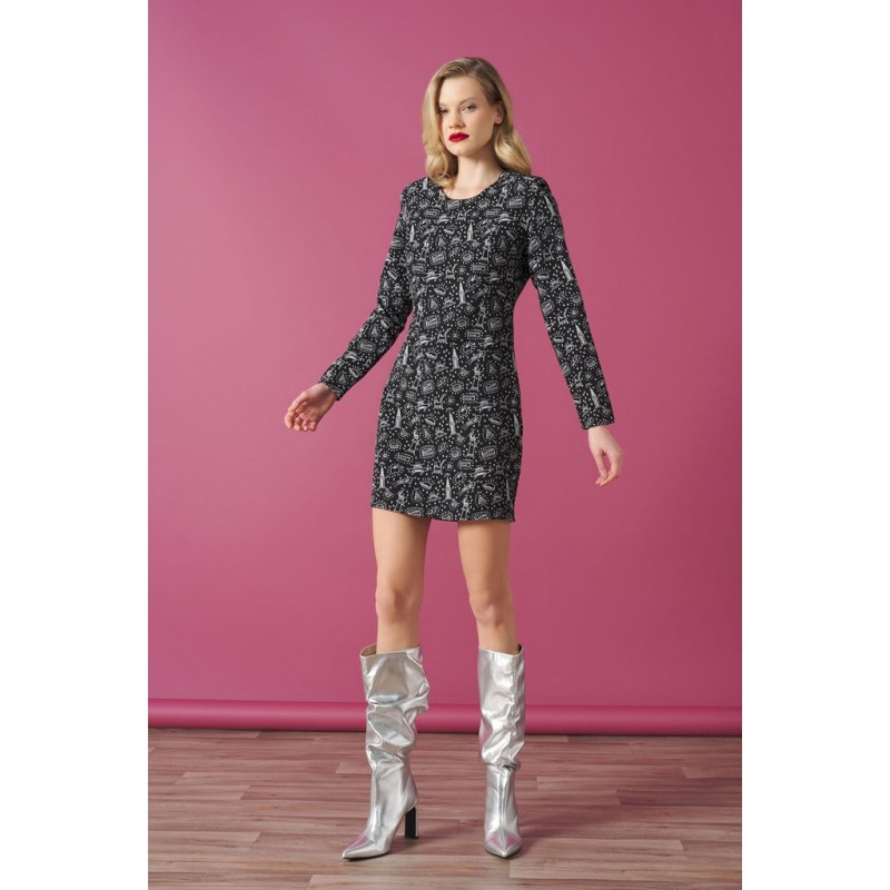 NY Dress Minueto. Vestido corto en color negro con estampado de motivos londinenses en blanco. De cuello redondo y manga larga, de diseño ajustado al cuerpo, rematado con cremallera en la parte trasera.