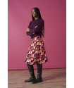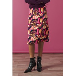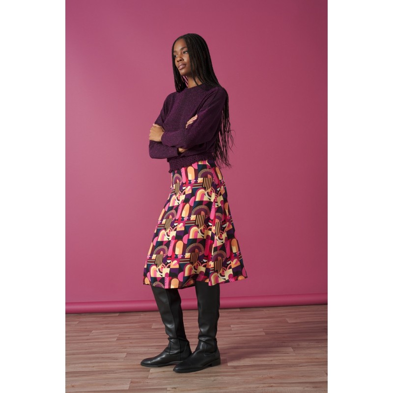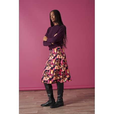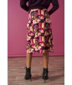 Maya Skirt Minueto. Falda midi, por la altura de la rodilla, totalmente estampada de formas geimétricas, ajustada a la cintura y corte en evasé.