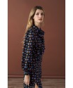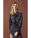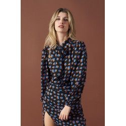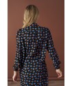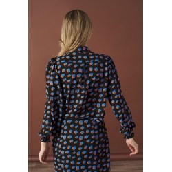 Indiana Top Minueto. Camisa tipo blusa de manga larga y cuello con solapa y lazada. De color negro con estampado en azul y naranja. Manga acabada en puño elástico ancho.