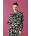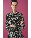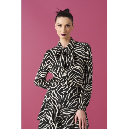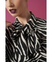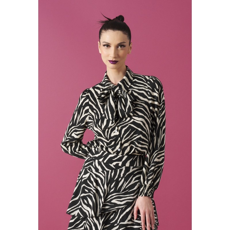 Boto Top Minueto. Camisa animal print de cebra, de manga larga con elástico en los puños. Con cierre de abotonadura delantera y solapa. Detalle de lazada al cuello.