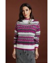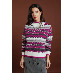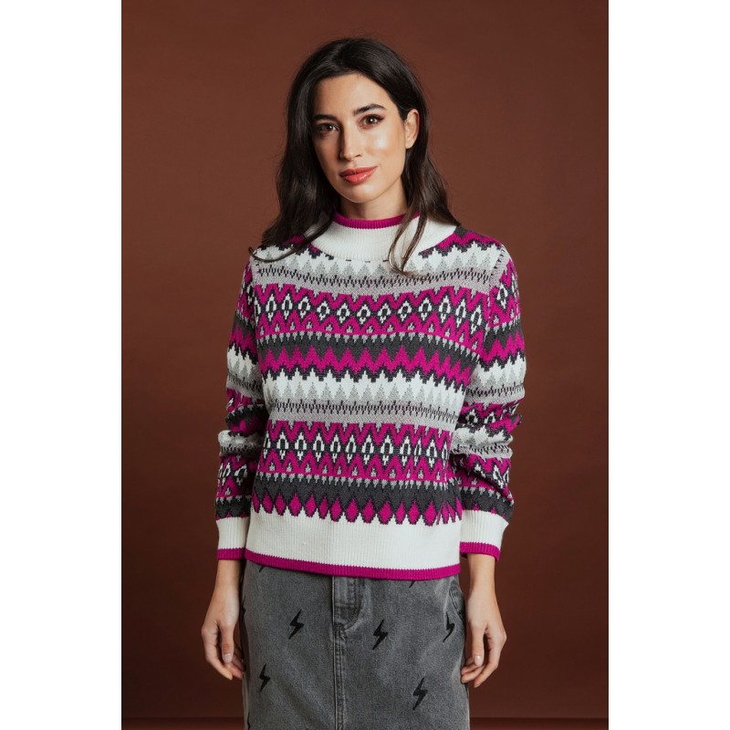 Kerry Sweater Minueto. Jersey de punto de cuello alto que combina los colores blanco, gris claro y oscuro con fúcsia en dibujo recreando grecas de forma muy original. Un jersey único y con mucha personalidad que no puedes dejar escapar.