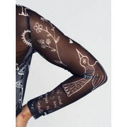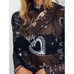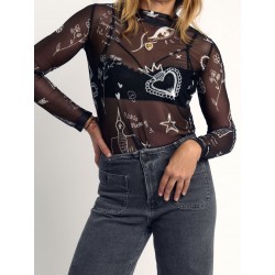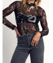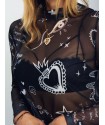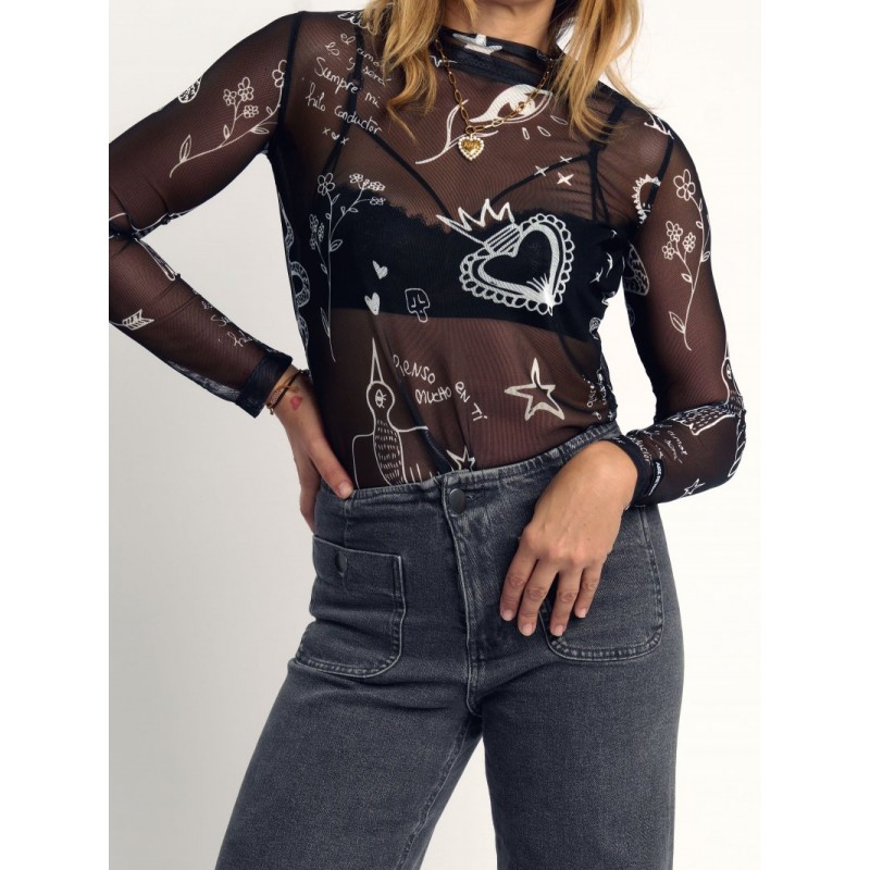 Camiseta Tul Poemas de Aire Retro. Camiseta de manga larga efecto segunda piel de tul en color negro, con ilustraciones grandes en color blanco del dibujo de poemas, ya utilizado en un vestido. Un blanco y negro esencial que no puede faltar en tu armario.
