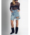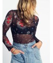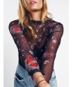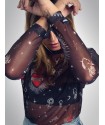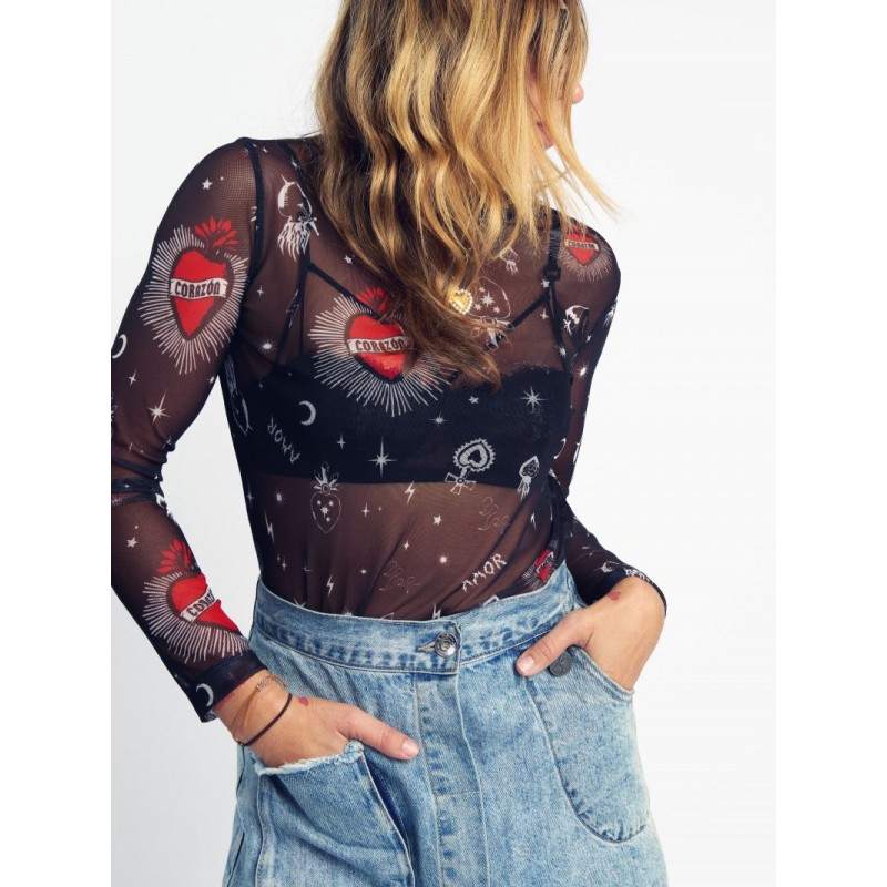 Camiseta Tul Corazones de Aire Retro. Camiseta de manga larga efecto segunda piel de tul en color negro, con ilustraciones grandes tonos rojos y blanco de las ilustraciones de corazones.