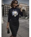 Vestido Bordado de Aire Retro. Vestido corto de manga larga, y cuello alto, ideal para estos días mas fríos. Manga balón, que le da un toque muy chulo y diferente, además el puño acaba en elástico, lo que hace que quede ligeramente abullonada. Lleva un gran bordado en la zona del pecho, en color rojo de una pareja muy aire retro abrazándose (es el mismo bordado que la blazer).