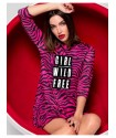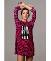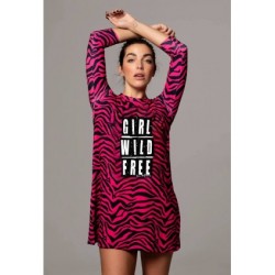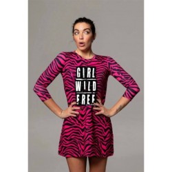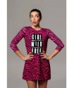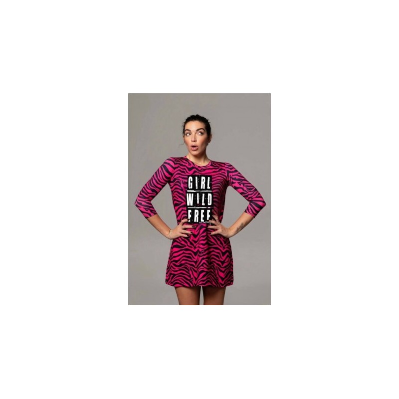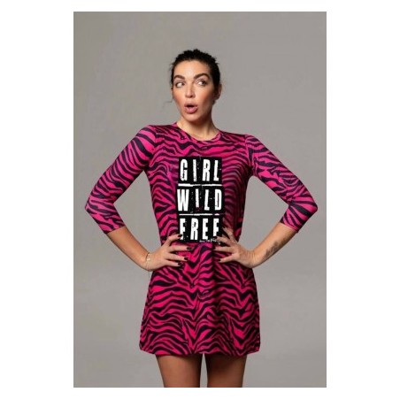 Vestido Girl Power Noc the Brand. Vestido estampado animal prit de cenra rosa fúcsia con impresión central "GIRL WILD FREE" a contraste. Su corte es evasé y le tejido es engomado, por lo que no necesita plancha.