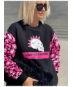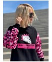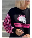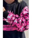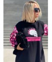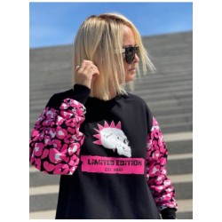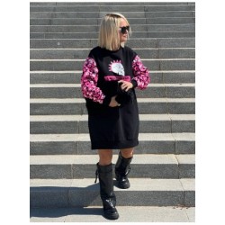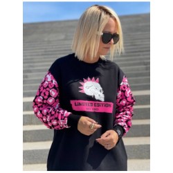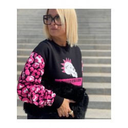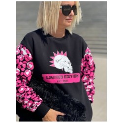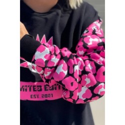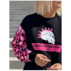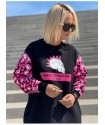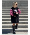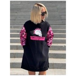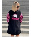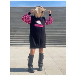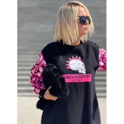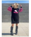 Vestido Neon Skull de la marca Noc the Brand. Vestido corto, tipo sudadera, con felpa con carda interior. En color negro con mangas animal print rosa neon, color que también utiliza en el print frontal con el logo de la marca. En corte es ligéramente over. Con bolsillos laterales y aberturas laterales en el bajo.