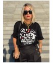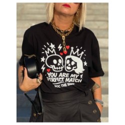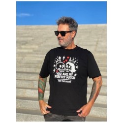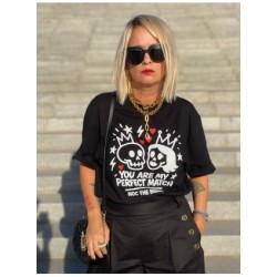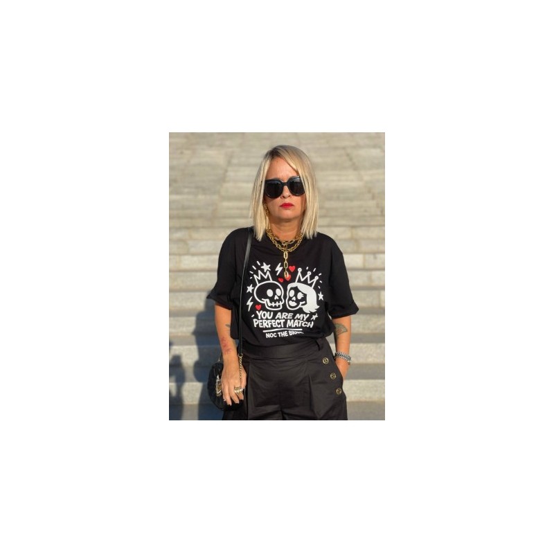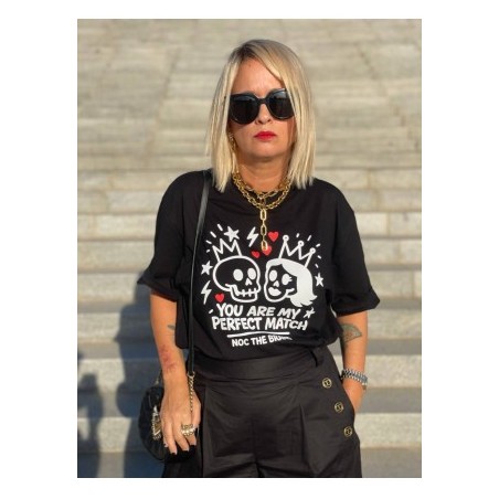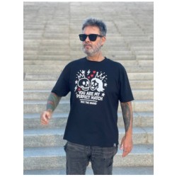 Cami Over Capri Perfect Match de Noc the Brand. Camiseta de manga corta, de corte amplio, y de corte unisex. Base en color negro y print frontal de dos muñecos, una pareja, en color blanco y rojo con la frase "You are my perfect match".