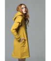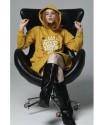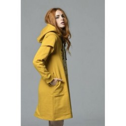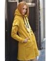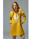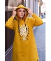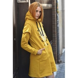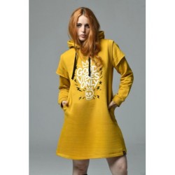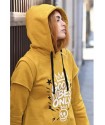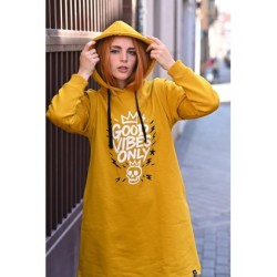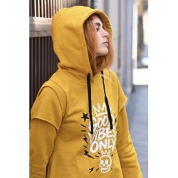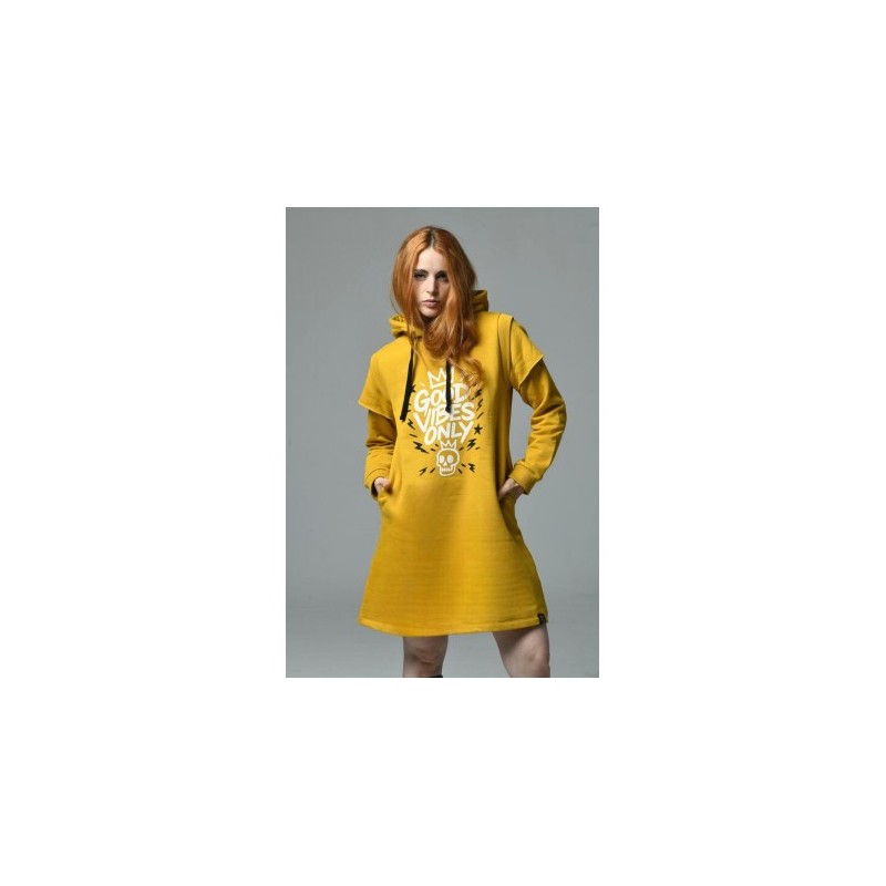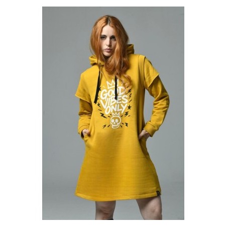 Vestido Good Vibes de la marca Noc the Brand. Vestido corto, tipo sudadera con gorro y con pelito por dentro súper gustoso. Base en color mostaza con print frontal "good vibes only" y una calavera en blanco a contraste. Efecto doble manga muy original y bolsillos laterales.
