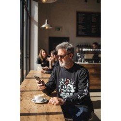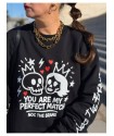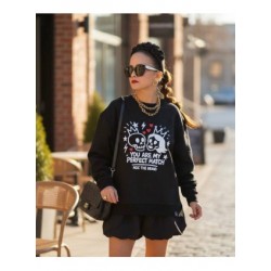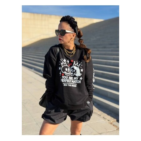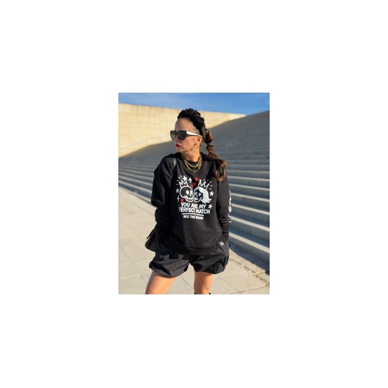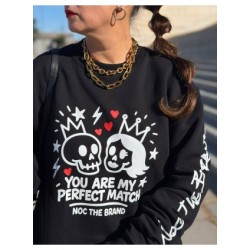 Sudadera Perfect Match de Noc the Brand. Sudadera de manga larga y cuello redondo, con base en color negro y print frontal de dos muñecos, una pareja, en color blanco y rojo con la frase "You are my perfect match".