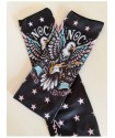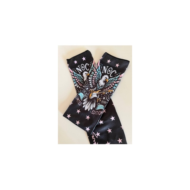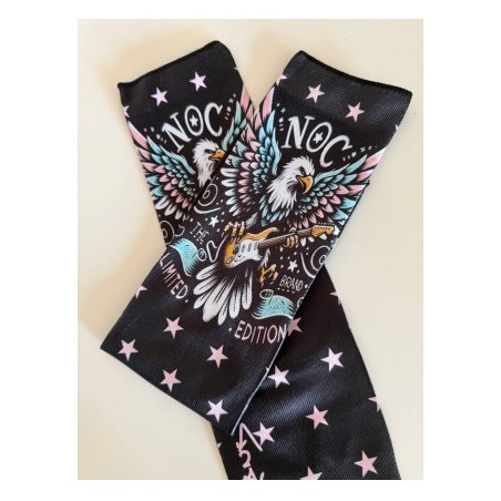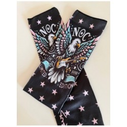 Calcetines Noc The Brand de media pierna, con base en color negro y con dibujo "Eagle" y total print de estrellas, diseñados en tejido Soft air que proporciona un gran confort, transpirabilidad excelente, anti-humedad con una fibra inteligente que proporciona frescor o calor al cuerpo. Composición soft air: poliamida, 5% algodón, 3% elastano, poliéster.