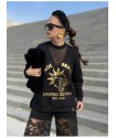 Base en color negro y total print en color bronce / dorado con rayos, calaveras, lunas, estrellas... ideal para cenas y eventos, pero sin perder ese toque rock que nos encanta