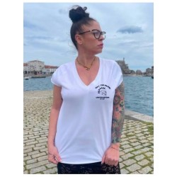 Cami Bad Decisions Blanca de Noc the Brand. Camiseta de corte recto, con base en color blanco, print frontal de una frase "Bad Decisions Make Good Stories" (las malas decisiones crean buenas historias) y con estrellas de color negrotambien en uno de los brazos.