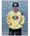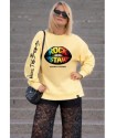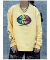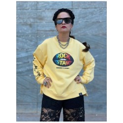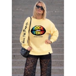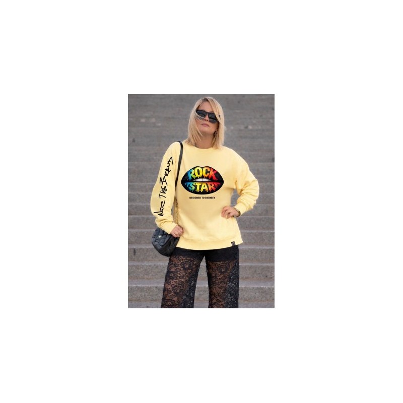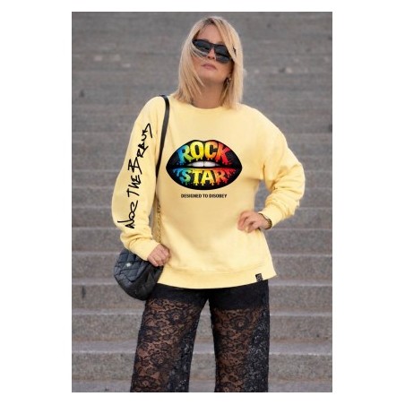 Sudadera Over Lips de Noc the Brand. Sudadera de magna larga, con base en amarillo clarito y print frontal de unos labios de color negro y con la frase "Rock Star" formada por varios colores (azul, verde, amarillo, rojo....).