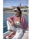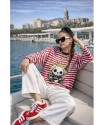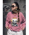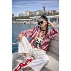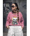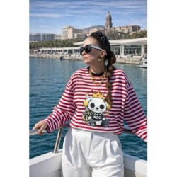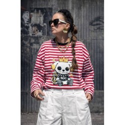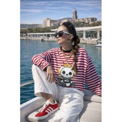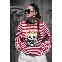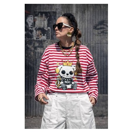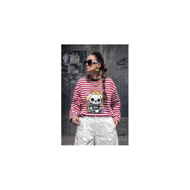 Cami Royal Dog Roja Over de Noc the Brand. Camiseta de manga larga, de corte amplio, oversize. A rayas blancas y rojas con ribe en negro e ilustración frontal de perro con corona muy NOC.