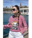 Montse y Sara llevan puesta una talla S. Mismo patrón que la cami Over Royal Dog (rayas blancas y marino).
