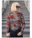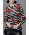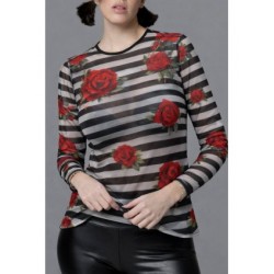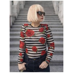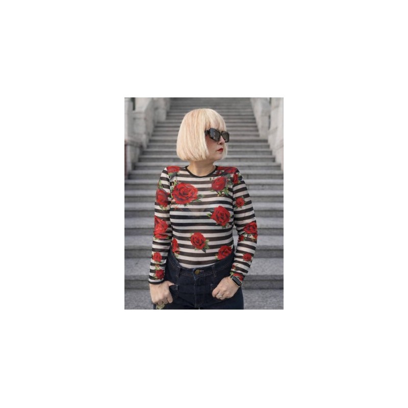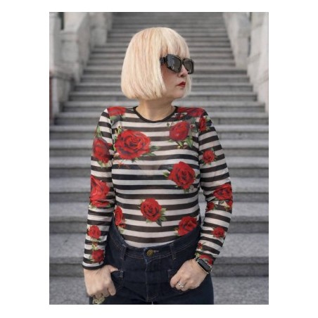 Cami Tul Rosas de Noc the Brand. Camiseta con cuello redondo y realizada en tul muy gustoso, de rayas blancas y negras combinada con rosas rojas.
